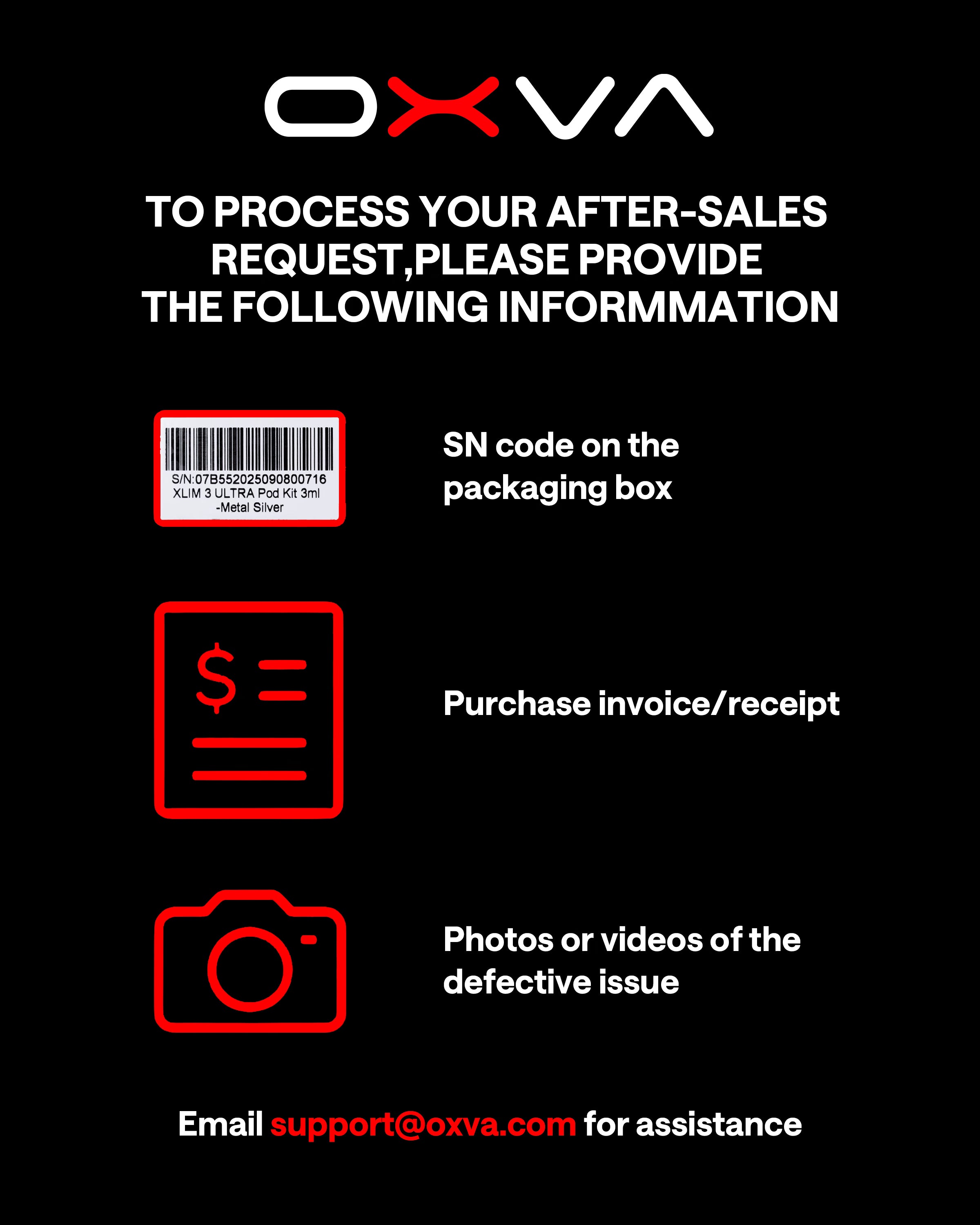 Grazie per l'acquisto OXVA prodotti. OXVA rispetterà i seguenti termini e condizioni per offrire all'acquirente originale la riparazione o la sostituzione in garanzia:La garanzia copre difetti di materiali o di fabbricazione in condizioni di normale utilizzo per 90 giorni dalla data di acquisto. La garanzia copre la riparazione o la sostituzione di eventuali parti danneggiate.La presente garanzia potrebbe essere invalidata nei seguenti casi: Il cliente non consegna la presente scheda di garanzia o la ricevuta originale di acquisto. Il guasto o il danneggiamento della merce è causato da un uso improprio o da modifiche non autorizzate. Guasti o danni alla merce causati da forza o impatto estremi, nonché condizioni operative non consigliate. Per maggiori dettagli, consultare il manuale dell'utente. Guasti o danni alla merce causati dall'esposizione all'acqua o ad altri liquidi conduttori. Guasti o danni alla merce causati dall'utilizzo di prodotti nonOXVA accessori di marca.Questa garanzia non copre articoli personali o di consumo come testine, cavi USB e bocchini.